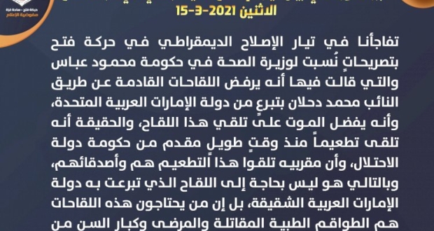 تيار الإصلاح الديمقراطي يصدر بيان حول رفض السلطة الفلسطينية تلقي لقاح كورونا