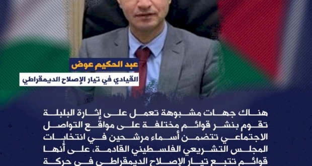 انفو: تيار الاصلاح الديمقراطي ينفى صحة ما نشر لقوائم التيار تتضمن أسماء مرشحين في انتخابات المجلس التشريعي الفلسطيني القادمة