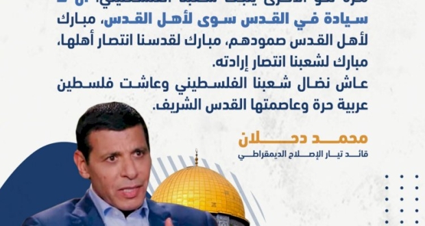 انفو: دحلان: الشعب الفلسطيني يثبت مرة تلو الأخرى بأنه لا سيادة في القدس سوى لأهل القدس