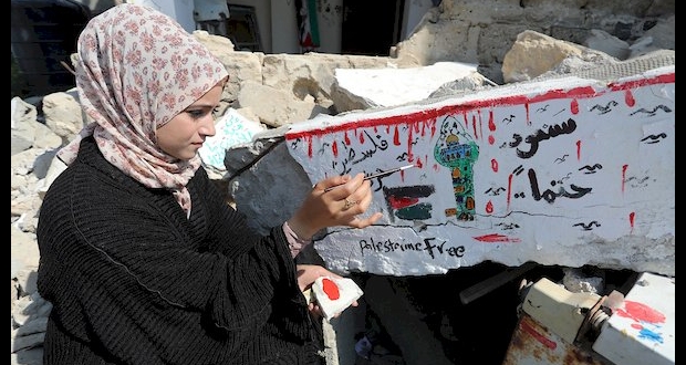 الفنانة الفلسطينية سجى موسى ٢٦ عاما ترسم على ركام منزل عائلتها المدمر خلال التصعيد الأخير