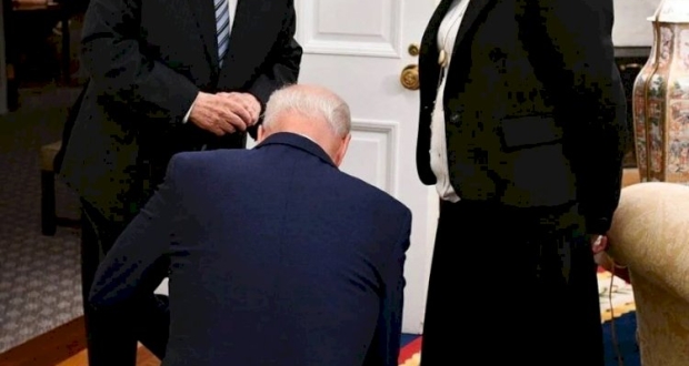 الرئيس الأمريكي يركع أمام مسؤولة إسرائيلية