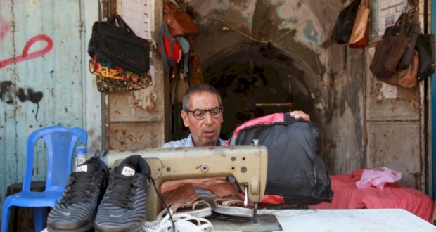 يجلس الفلسطيني خليل حمدان (64) عاما داخل حجرة صغيرة على ماكينة الخياطة في سوق الزاوية الشعبي وسط مدينة غزة، لإصلاح الأحذية والحقائب الممزقة قبل بدء العام الدراسي الجديد.