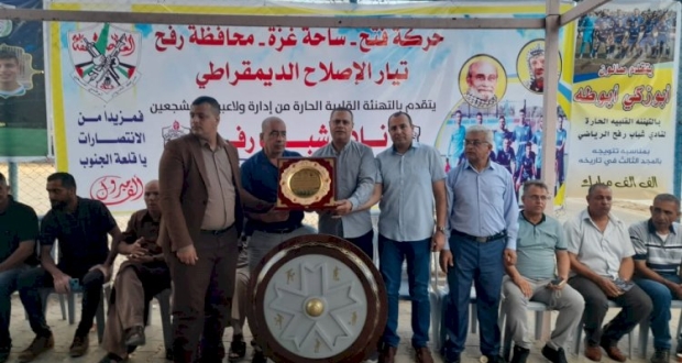 زارت حركة فتح بمحافظة رفح ولجنة الاندية بمجلس الشباب الفلسطيني، نادي شباب رفح الحاصل على لقب الدوري الممتاز 2021، في مقر النادي، بحضور الأخ المناضل د.صلاح العويصي أمين سر هيئة العمل التنظيمي بساحة غزة ، ووفد من قيادة و أعضاء تيار الاصلاح الديمقراطي بمحافظة رفح.