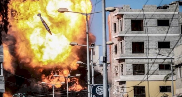 وتظهر الصورة تصاعد كتلة لهب ضخمة من بنك الانتاج في غزة إثر استهدافه بصاروخ إسرائيلي من طائرة "f16" ولحظة سقوط صاروخ اخر في ذات اللقطة.