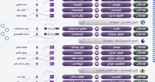 غزة - فتح ميديا:تتجه أنظار عشاق كرة القدم اليوم الأحد لعدة مباريات في الدوريات الأوروبية المختلفة، والكونفدرالية الإفريقية.