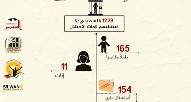 اعتقلت سلطات الاحتلال الإسرائيلي خلال شهر نيسان/أبريل 2022، (1228) فلسطينيا/ة من الأرض الفلسطينية المحتلّة، من بينهم (165) طفلاً، و(11) من النساء، وهي أعلى نسبة في حالات الاعتقال منذ مطلع العام الجاريّ، وشكلت حالات الاعتقال في القدس التحول الأساس في هذه النسبة.