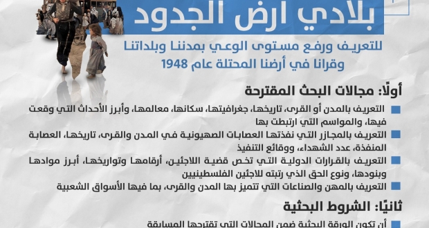 تعلن لجنة اللاجئين في حركة فتح بساحة غزة، اليوم الأحد، عن إطلاق مسابقة بحثية، تحمل عنوان "بلادي أرض الجدود".