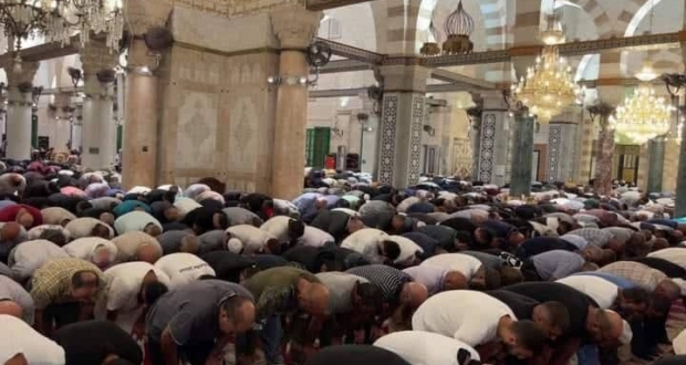 واحتشد آلاف المصلين في باحات المسجد الأقصى الذين شدوا الرحال إليه مختلف المناطق سواء من الضفة المحتلة أوالداخل المحتل، ومدينة القدس المحتلة.