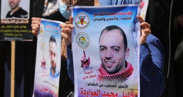 ورفع المشاركون في الوقفة التي دعا لها كل من اللجنة الوطنية لدعم الأسرى بالتعاون مع نادي الأسير الفلسطيني، الأعلام الفلسطينية واللافتات المنددة بالاعتقال الإداري، وصور الأسير عواودة، ورددوا الهتافات التي تحيي صموده، وصمود جميع الأسرى.