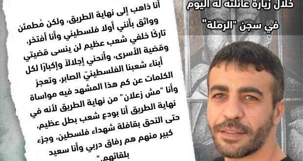 وأضاف: "أنا ذاهب إلى نهاية الطريق، ولكن مُطمئن وواثق بأنني أولاً فلسطيني وأنا أفتخر، تاركًا خلفي شعب عظيم لن ينسى قضيتي وقضية الأسرى، وأنحني إجلالاً وإكبارًا لكل أبناء شعبنا الفلسطينيّ الصابر".