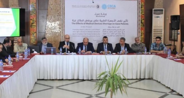 ودعا الوكيل المساعد في وزارة الصحة المهندس بسام الحمادين خلال ورشة عمل نظمها المركز الفلسطيني لحقوق الإنسان حول تأثير نقص الأجهزة الطبية على مرضى قطاع غزة وجاءت بمشاركة كوادر وزارة الصحة وبمشاركة منظمة الصحة العالمية وشركات توريد الأجهزة الطبية إلى الضغط على الاحتلال الإسرائيلي لإجباره لإدخال الأجهزة الطبية وقطع الغيار اللازمة لصيانة الأجهزة المتعطلة.