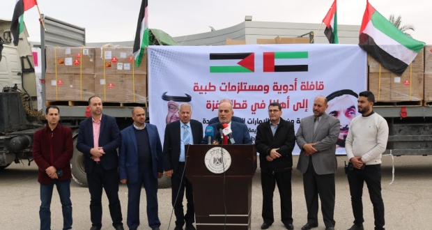 وقال الطيبي خلال مؤتمر صحفي لاستقبال القافلة الطبية الإماراتية التي وصلت قطاع غزة، عبر معبر رفح: " أن هذه القافلة المكونة من كافة أنواع الأدوية الطبية جاءت بناء على طلب من وزارة الصحة الفلسطينية في قطاع غزة".
