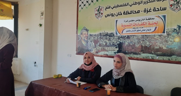 عقدت لجنة الكفاءات النسوية بمجلس المرأة في حركة فتح بمحافظة خان يونس، لقاءًا تثقيفياً مستهدفاً الأخوات الهيكل، بعنوان "الإعلان العالمي لحقوق الإنسان والقانون" ضمن سلسلة لقاءات تم تنفيذها بالتزامن مع أيام مناهضة العنف ضد المرأة حملة ال ١٦ يوم.