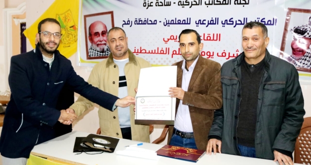 نظمت لجنة المكاتب الحركية بمحافظة رفح والمكتب الحركي للمعلمين، اليوم الأربعاء، حفلاً تكريمياً للمعلمات والمعلمين من أبناء الهيئة العامة للمكتب الحركي بمناسبة يوم المعلم الفلسطيني, تقديرا لهم لما بذلوه من جهود وتضحيات في خدمة التعليم والمسيرة التعليمية وذلك في مقر حركة فتح محافظة رفح .