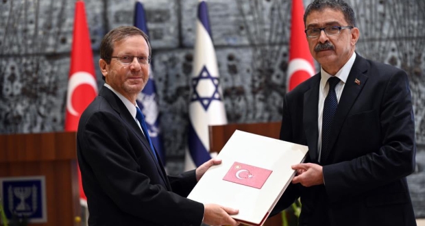 وخلال مؤتمر صحفي مشترك أعقب مراسم تقديم السفير التركي خطاب اعتماده إلى الرئيس الإسرائيلي إسحاق هرتسوغ أمس الأربعاء، ذكر تورونلار أن العلاقات التركية الإسرائيلية قد قطعت شوطا طويلا من خلال الزيارات الثنائية في الفترة الأخيرة، وأنه تم تبادل تعيين السفراء بعد انقطاع دام نحو 4.5 سنوات.