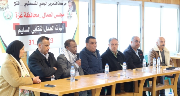 وأكد توفيق أبو خوصة القيادي في حركة فتح على أهمية النقابات في الهيكل التنظيمي بحركة فتح ودور نقابات العمال في نشر الوعي النقابي والتنظيمي والقانوني بين فئة العمال مستعرضا "نشأة النقابات والتي تختص بالعمال في تاريخ الثورة الفلسطينية وأثرها الكفاحي بالدفاع عن حقوق العمال ضد المحتل الإسرائيلي" وأيضا أثر الإنقسام الفلسطيني في تقويض عمل النقابات ومنع إنتاجية خدمة العمال.