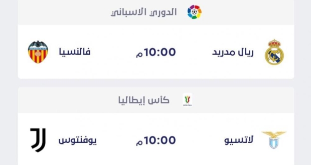 ويلعب في ربع نهائي كأس إيطاليا، يوفنتوس مع لاتسيو الساعة العاشرة مساءً، وتذاع عبر قناة AD SPORTS Premium 1.