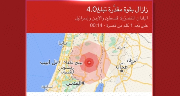 ووفقاً لمراكز مسح الزلازل، فعدة زلازل ضربت فلسطين المحتلة، ومراكزها نابلس، الزلزال الأول يبلغ قوته 4.4 درجة على مقياس ريختر، والثانية قوتها 4.8 درجة على مقياس ريختر