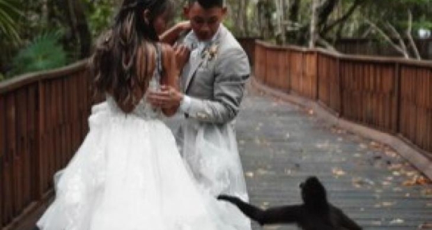 اقتحمت قردة مشاكسة، حفل زفاف، امرأة أمريكية تدعى صوفى نجو، وزوجها أندور، التي أقامته فى المكسيك.