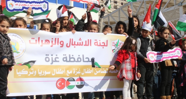 ورفع الأطفال المشاركون في الوقفة لافتات كُتب عليها عبارات تضامنية باللغتين العربية والتركية، كما رفعوا العلم الفلسطيني والسوري والتركي.
