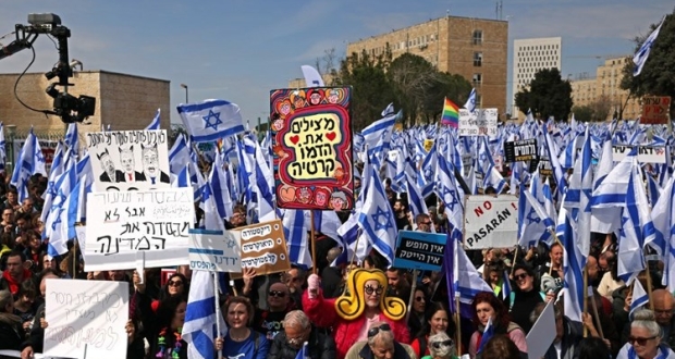 وصل نحو 15000 متظاهر إسرائيلي إلى شارع كابلان في القدس الغربية، بالقرب من مبنى الكنيست، حيث سيتم التصويت على خطة حكومية مثيرة للجدل لإصلاح القضاء.