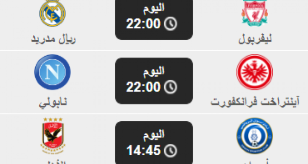 ويلعب ليفربول الإنجليزي مع ريال مدريد الإسباني الساعة العاشرة مساءً بتوقيت فلسطين، ومصر، وتنقل المباراة عبر قناة beIN Sports 1 HD Premium، وفي ذات التوقيت يتقابل آينتراخت فرانكفورت الألماني مع نابولي الإيطالي، وتبث قناة beIN Sports 2 HD Premium اللقاء.