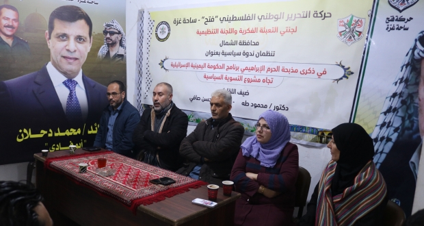 نظمت لجنتا التعبئة الفكرية والتنظيمية في محافظة الشمال ندوة سياسية بعنوان "في ذكرى مذبحة الحرم الإبراهيمي.. برنامج الحكومة اليمينية الإسرائيلية تجاه مشروع التسوية السياسية" استضافت فيها الدكتور "محمود طه" والدكتور "حسن صافي"، بمناسبة مرور 29 عامًا على المذبحة، واستهدفت مكونات العمل التنظيمي في المحافظة.