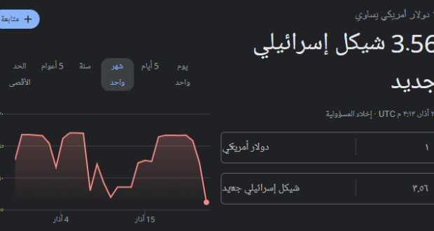 وشهد سعر صرف الدولار مقابل الشيكل، انخفاضاً كبيراً عما كان صباحاً، حيث سجل سعر صرف الدولار الآن مقابل الشيكل 3.56 على الشاشة.