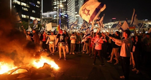 وخرج عشرات الآلاف من الإسرائيليين في تظاهرات احتجاجية في تل أبيب وحيفا ونتانيا وهرتسيليا وعدة مناطق، رغم إعلان نتنياهو عن تعليق طرح التشريعات للتصويت في الكنيست، حيث يرى المحتجون أن هذا الإعلان هو محاولة لاحتواء الاحتجاجات التي وصلت ذروتها الأسبوع الماضي بإعلان الإضراب في العديد من القطاعات، مؤكدين أن تعليق طرح التشريعات لا يعني إلغائها.