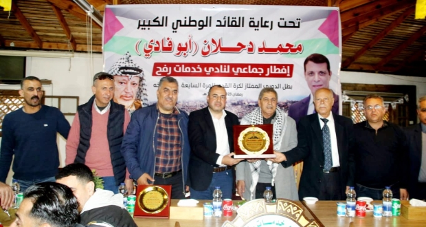 برعاية كريمة من قائد تيار الإصلاح الديمقراطي في حركة فتح، الأخ النائب محمد دحلان، نظمت لجنة الأندية بمجلس الشباب الفلسطيني بساحة غزة، اليوم الاثنين، إفطاراً جماعياً لنادي خدمات رفح الرياضي ممثلاً برئيس وأعضاء مجلس الإدارة والجهازين الفني والإداري واللاعبين، بمناسبة تتويجه بطلاً للدوري الممتاز لكرة القدم للمرة السابعة في تاريخه.
