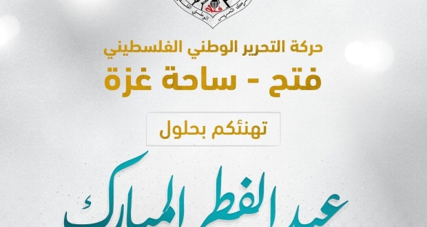تتقدم حركة التحرير الوطني الفلسطيني فتح بساحة غزة، بأصدق التهاني والتبريكات من عموم أبناء شعبنا المناضل على امتداد تواجدهم في الداخل والخارج، ومن مكوناته الوطنية والمجتمعية بمناسبة حلول عيد الفطر السعيد.