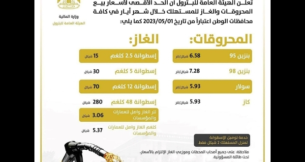 أعلنت الهيئة العامة للبترول التابعة لوزارة المالية، مساء اليوم الأحد، أسعار المحروقات والغاز لشهر أيار/مايو المقبل.