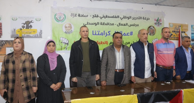 نظم مجلس العمال بحركة فتح في ساحة غزة وبحضور قيادة الساحة، اليوم الاثنين، مهرجاناً عمالياً بعنوان "عمالنا كرامتنا" بمناسبة يوم العمال العالمي، في المحافظة الوسطى.