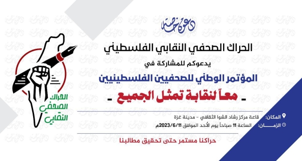 ويدعو الحراك الصحفي النقابي الفلسطيني كآفة الأطر والكتل الصحفية، والشخصيات الإعلامية من مختلف التوجهات، للمشاركة في فعاليات المؤتمر الوطني، لتصويب المسار النقابي ولانتزاع حقوق الصحفيين في نقابة مهنية تمثل الجميع، بعيدًا عن سياسة الإقصاء والتفرد.