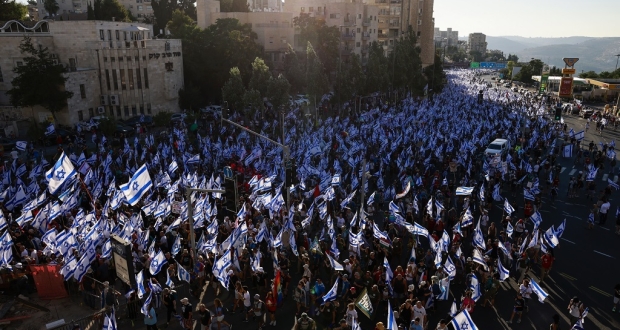 وصل عشرات الآلاف من الإسرائيليين، مساء يوم السبت، إلى أمام مقر "الكنيست" الإسرائيلية في القدس، في تظاهرة انطلقت من تل أبيب يوم الثلاثاء الماضي، احتجاجا على حكومة بنيامين نتنياهو وخطتها لإضعاف "جهاز القضاء".