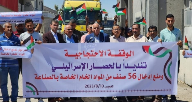نظَّم الاتحاد العام للصناعات الفلسطينية، اليوم الخميس، وقفةً احتجاجية أمام بوابة معبر كرم أبو سالم جنوب قطاع غزّة، احتجاجاً على الحصار "الإسرائيلي" ومنع إدخال 56 صنفاً من المواد الخام الخاصة بالصناعة.