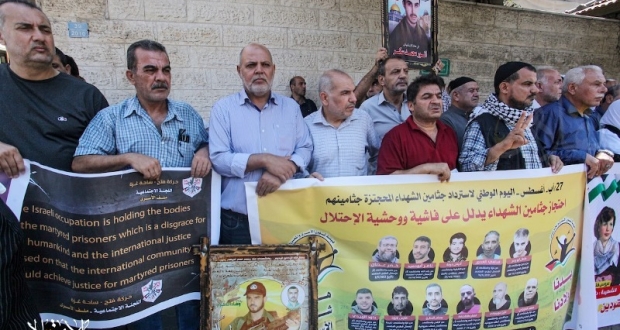 وجاءت هذه الوقفة تزامناً مع اليوم الوطنى لاسترجاع جثامين الشهداء المحتجزة لدى الاحتلال والذي تجاوز عددهم الـ "٣٩٢" جثمان وبينهم جثامين "١١" شهيد من الأسرى.