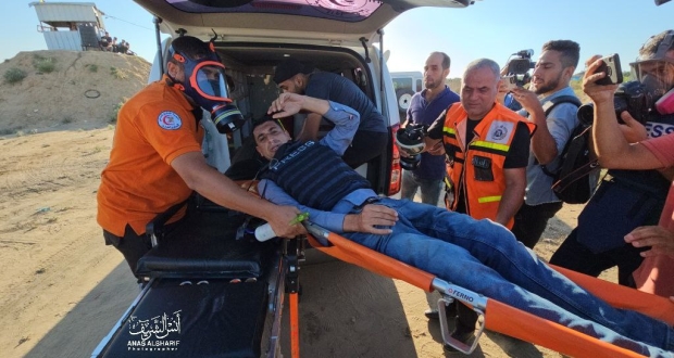 وأفاد مصادر صحفية، بإصابة صحفيين بشكل مباشر بقنابل الغاز السام المسيل للدموع التي أطلقها جنود الاحتلال شرق بلدة جباليا شمال القطاع على المواطنين والصحفيين، إضافة إلى إصابة ٱخرين بحالات اختناق.