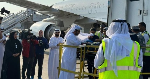 وحطت الطائرة القادمة من مطار العريش في جمهورية مصر العربية، في مطار أبوظبي، والتي تحمل على متنها الأطفال والذين هم في أمس الحاجة للمساعدة الطبية ممن يعانون من إصابات وحروق شديدة، ومرضى سرطان يحتاجون إلى علاج حثيث.