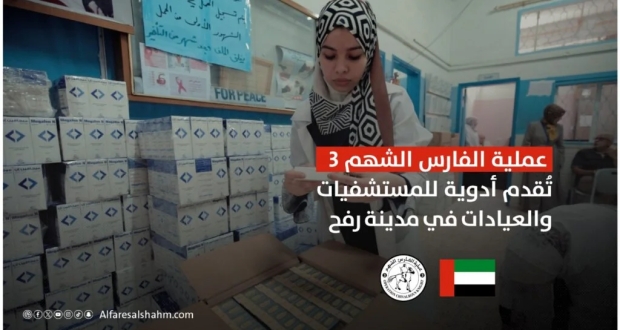 قدمت عملية الفارس الشهم 3 أدوية ومستلزمات طبية للمستشفيات ومؤسسات الرعاية الصحية في مدينة رفح، للمساهمة في توفير العلاج للأسر الفلسطينية النازحة.