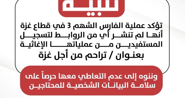 وأكدت عملية (الفارس الشهم 3) في قطاع غزة أنها لم تنشر أي من الروابط لتسجيل المستفيدين من عملياتها الإغاثية بعنوان / تراحم من أجل غزة.