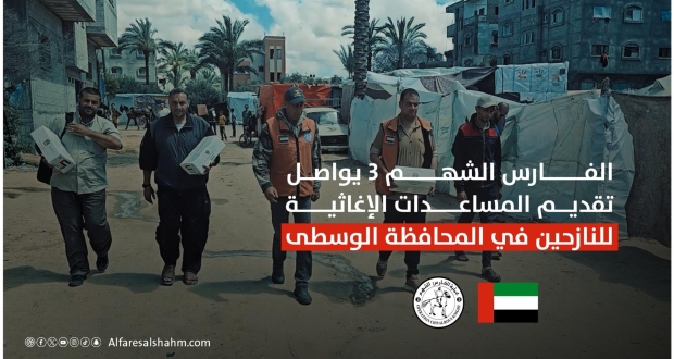 الفارس الشهم 3 يُواصل تقديم المساعدات الإغاثية للنازحين في المحافظة الوسطى، بدعم من دول الإمارات العربية المتحدة، وزع متطوعو عملية الفارس الشهم 3 طرود تمور وطرود غذائية وخيام على النازحين في المحافظة الوسطى ضمن الحملة الإغاثية التي تهدف للتخفيف عنهم وتوفير المواد الأساسية لهم في ظل عدم توفر المواد الغذائية والمستلزمات الأساسية نتيجة الأوضاع الصعبة التي يواجهها سكان قطاع غزة.
