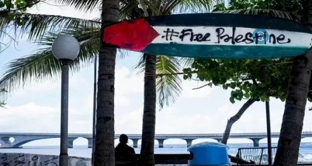 ملصق داعم للقضية الفلسطينية على لافتة شارع في ماليه، جزر المالديف (Getty Images)