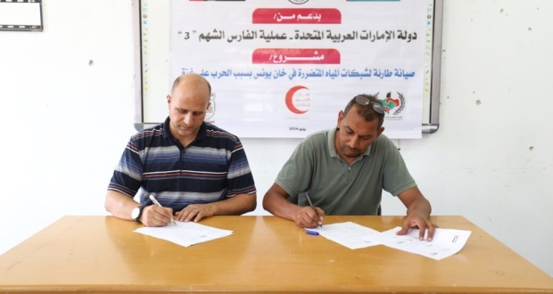 وقعت اللجنة الوطنية للشراكة والتنمية، مذكرة تفاهم حول مشروع الصيانة الطارئة لشبكات المياه المُتضررة من العدوان في مدينة خان يونس، بتكلفة (54) ألف دولار، وذلك ضمن عملية الفارس الشهم(3)،وبتمويل كريم من دولة الإمارات العربية المتحدة.