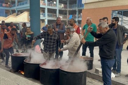 لجنة طوارئ المحافظة الوسطى تُعد الطعام لألاف النازحين في مخيم المغازي
